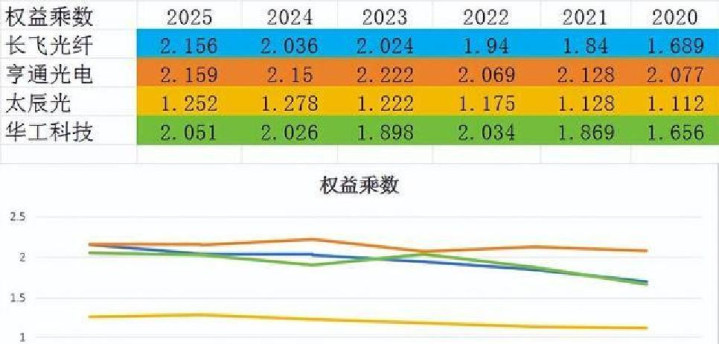 第二步看权益乘数(反映企业用杠杆扩张的程度):四家公司杠杆率均有所提升,但资金成本存在差异——亨通光电、长飞光纤财务杠杆较高,不高杠杆意味着风险,一旦市场波动,盈利可能起伏;太辰光净利高、杠杆低,经营稳定性更强。