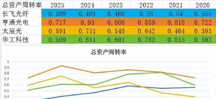 第三步看总资产周转率(反映资产运营效率):亨通光电因海缆项目较多,资产周转效率最高;太辰光整体周转较快,资产利用充分;长飞光纤近两年资产投入增长快,但市场消化压力大,周转率反而下降。